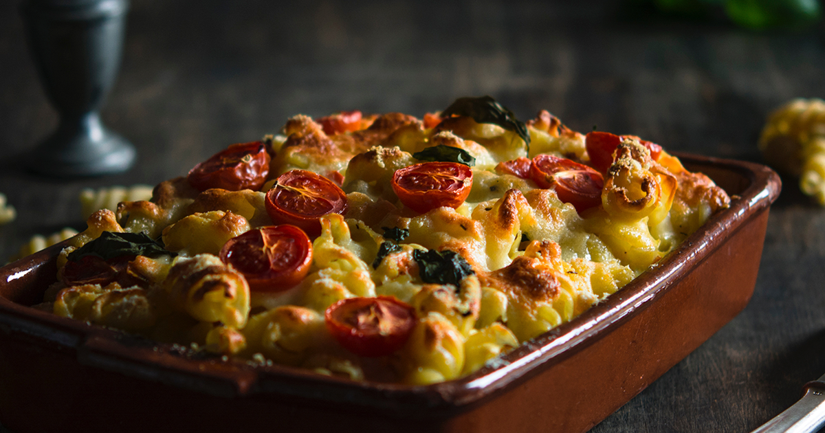 Forvarm ovnen til 200 grader. Hæld macaronien i et ovnfast fad og drys raspen over samt ekstra revet cheddarpst. Bages i 10 minutter indtil toppen er gylden. Pynt med friske krydderurter og cherrytomater (kan også bages med pynten).
