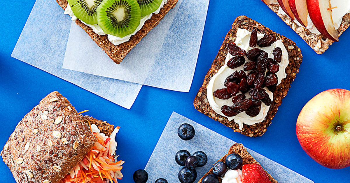 Smør rugbrød med friskost eller smør og kom rosiner på.