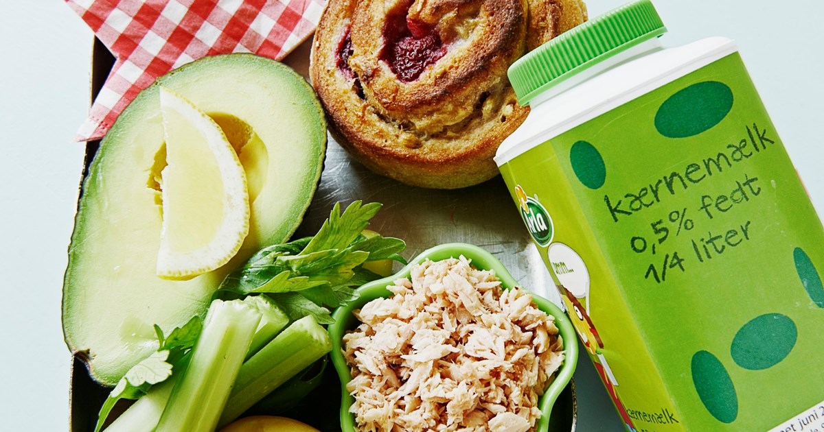 Flæk avocadoen og gnid snitfladerne med lidt citronsaft. Pak de halve avocadoer i madkasser sammen med citronbåde, den tilsmagte tun, bladselleri og kartofler. Læg en frugt-snegl i hver madkasse sammen med en teske og en serviet.