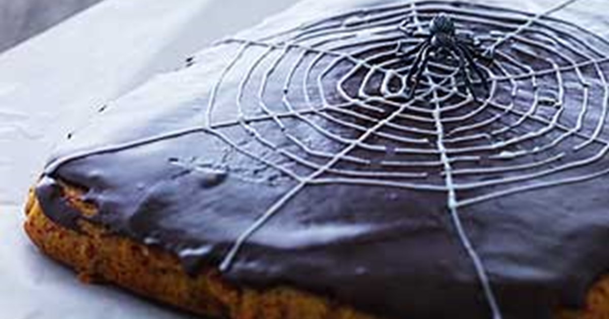 Rør flormelis, citronsaft og vand sammen. Tag ca. 3/4 dl glasur fra. Rør kakao i resten af glasuren og fordel den på kagen. Kom den hvide glasur i en plasticpose, og klip et meget lille hul i hjørnet. Tegn et uhyggeligt mønster på kagen. Pynt evt. med en lille plastic-edderkop.