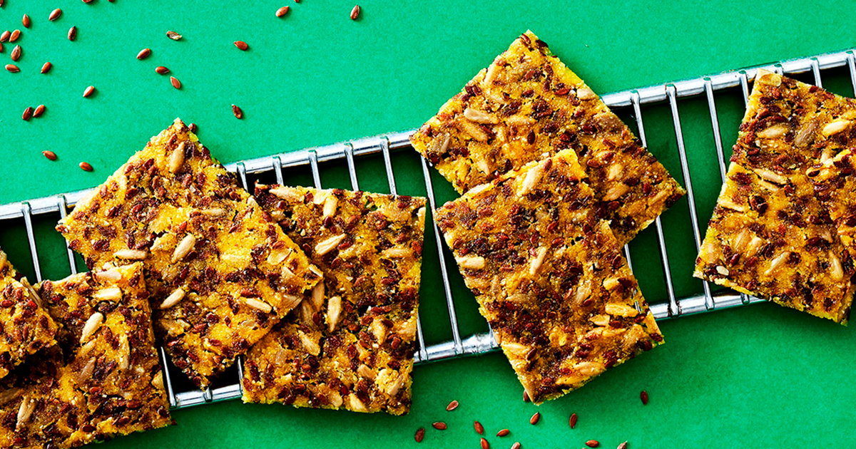 Kog vandet og hæld det i en skål. Bland olie og de øvrige ingredienser i og rør det hele sammen til en løs dej. Fordel dejen på en bageplade med bagepapir. Bagetid: 30-35 min. midt i en 150° forvarmet ovn (varmluft 130°). Tag knækbrødet ud af ovnen og skær det i firkanter. Sæt knækbrødet tilbage i ovnen og bag yderligere 1 25-30 min. Lad dem afkøle på en bagerist. Giv knækbrød med i et lille bæger.