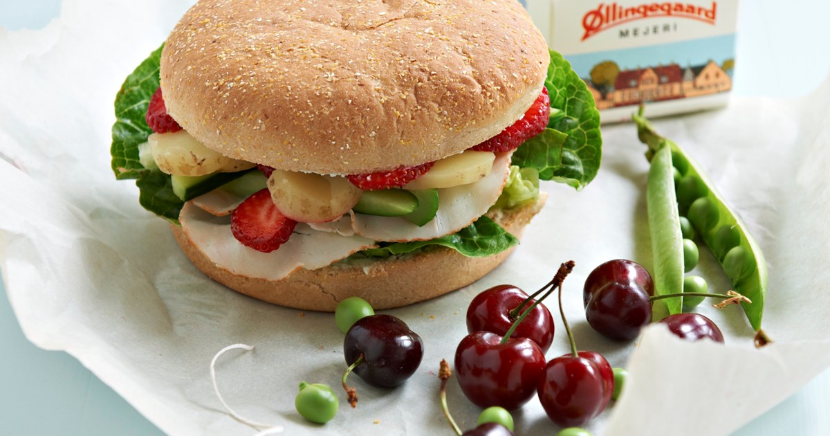 3. Læg bollerne sammen om salat, kyllingepålæg, agurk, jordbær, kartofler, salt og peber.