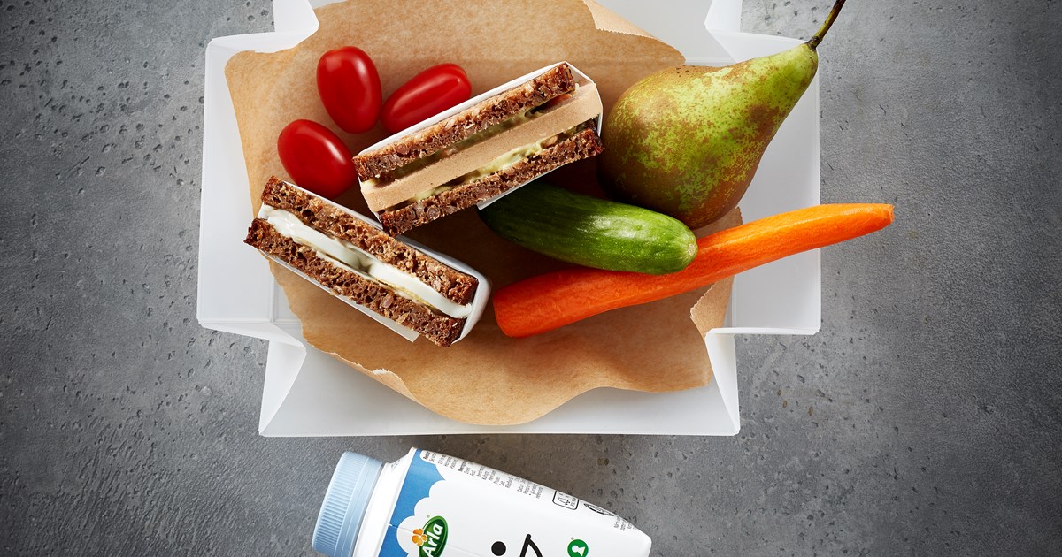 Som tilbehør bruges for eksempel cherrytomater, agurk, gulerødder og en pære.