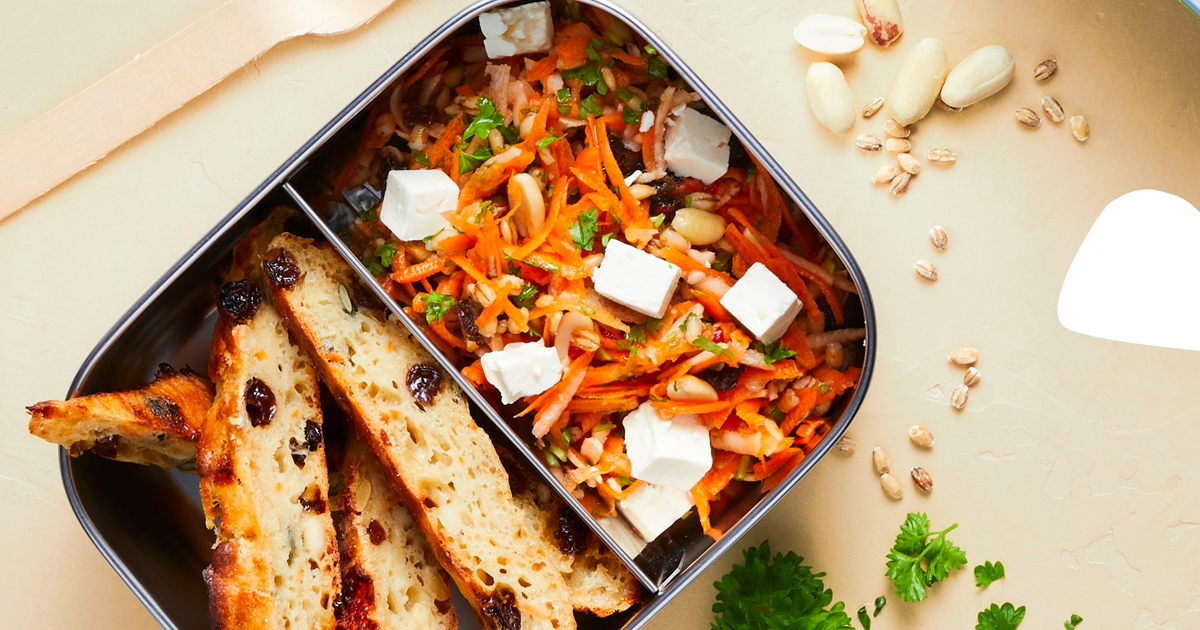 Tilbered fuldkornsperlebyggen som anvist på pakken. Rør chilisauce, salattern, purløg, uasaltede peanuts og rosiner. Vend blandingen godt sammen med de revne rødder og smag til.