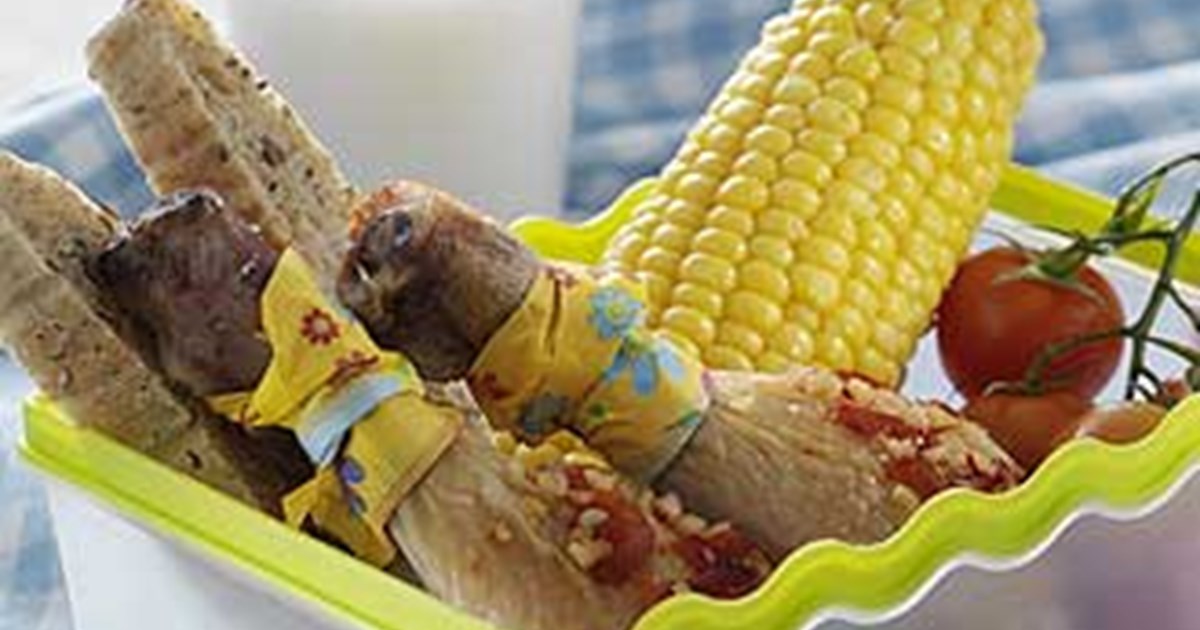 Smør kyllingelårene med pestoen, og læg dem i madkassen sammen med majskolbe og en skive groft lyst brød og nogle cherrytomater.