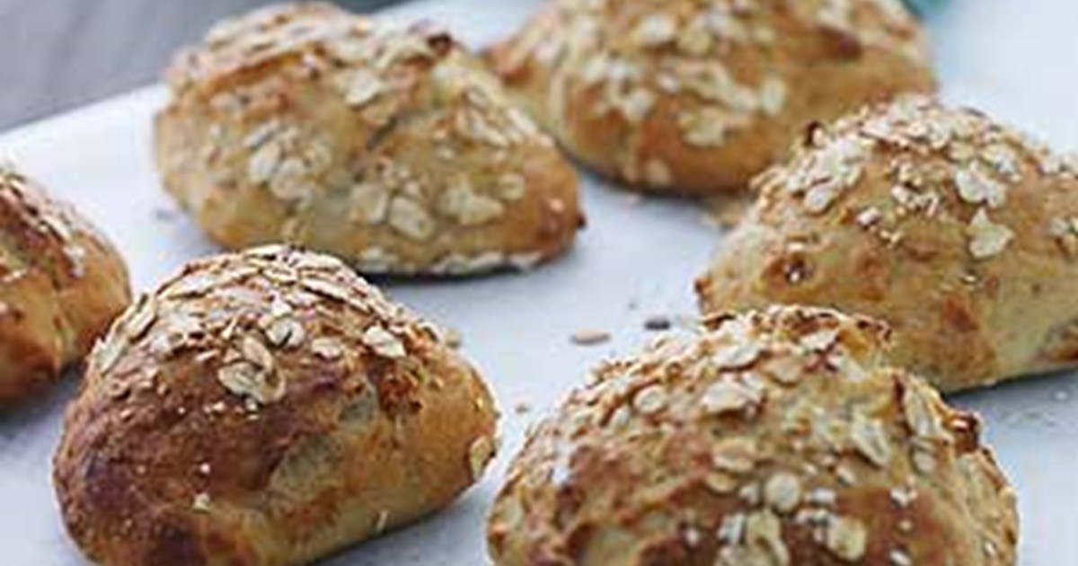 2. Tænd ovnen på 250 grader (helst varmluft). Dejen er klistret og tages nemmest med en spiseske, der dyppes i vand mellem hver gang. Fordel dejklumperne på to bageplader med bagepapir. Drys bollerne med resten af havregrynene.