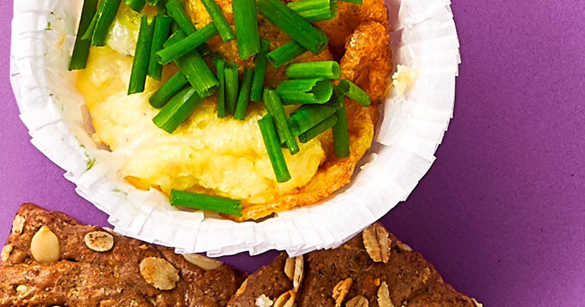 Slå æg ud i en lille skål. Tilsæt hytteost, salt og peber. Pisk alle ingredienser sammen med en gaffel. Smør en muffinbradepande eller en muffinform grundigt, og hæld æggemassen heri. Bag i en 180C forvarmet ovn i 10-12 minutter.