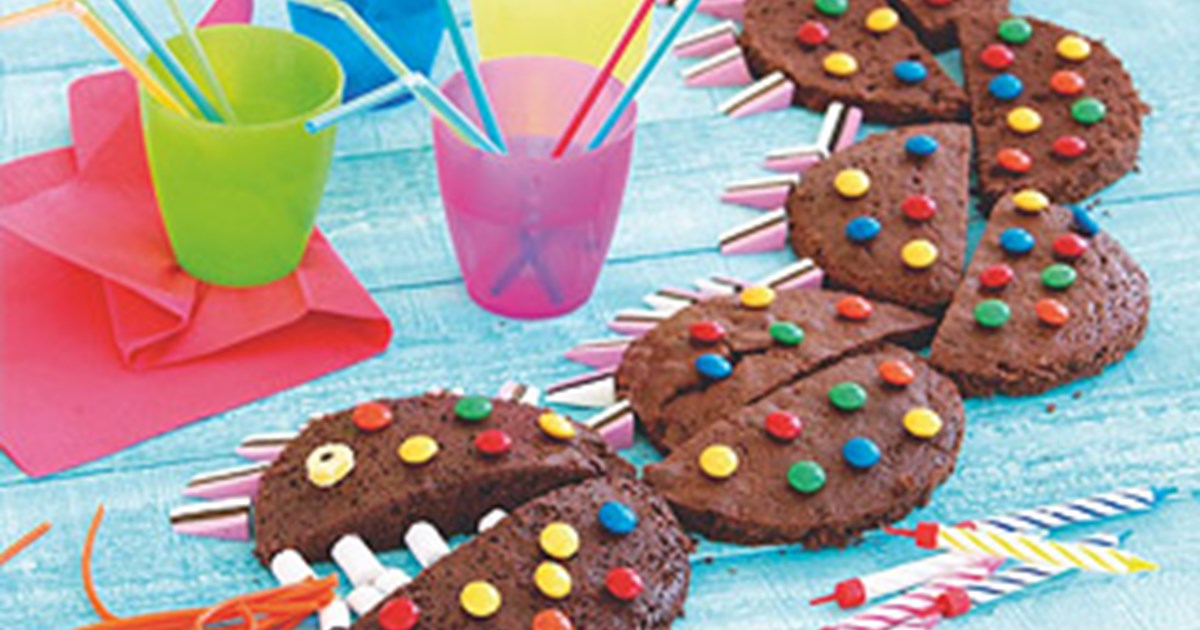 Bag dem i 45 min. ved 180 grader. Lad dem afkøle og flæk dem tre gange vandret igennem. Del hver cirkel i halve (man kan evt. lave cirklerne lidt mindre efter en fast skabelon), og læg dem forskudt til en ormedrage på et stykke papir på et papstykke eller en træplade.