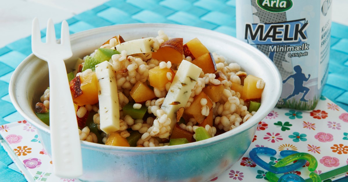 Perlebygsalat med blommer og ost