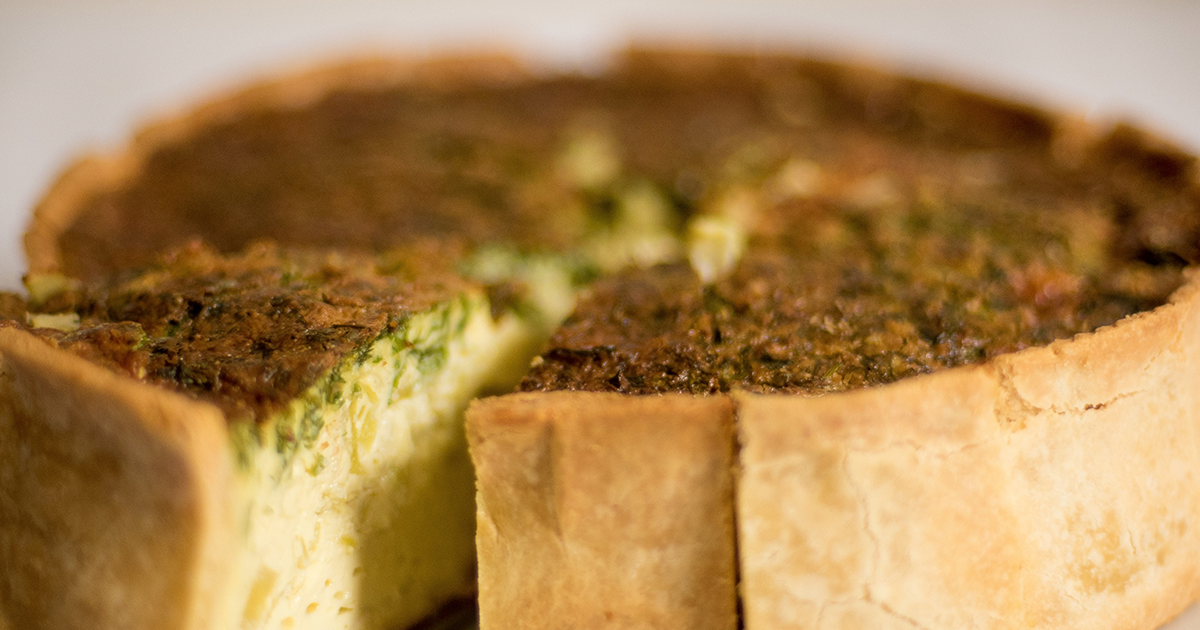 Mens dejen afkøles, varmes olie i en pande. Tilsæt bacon, løg, smør, timian og laurbærblade, og steg inden baconen er sprød. Fjern derefter laurbærblade og timian fra panden.