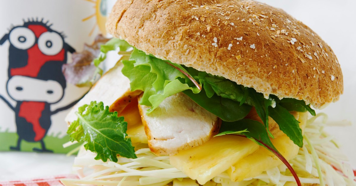 Rist bollerne og lad dem køle af. Flæk bollerne, smør med karrydressing og læg dem sammen om hvidkål, ananas, kyllingekød og salatblade.
