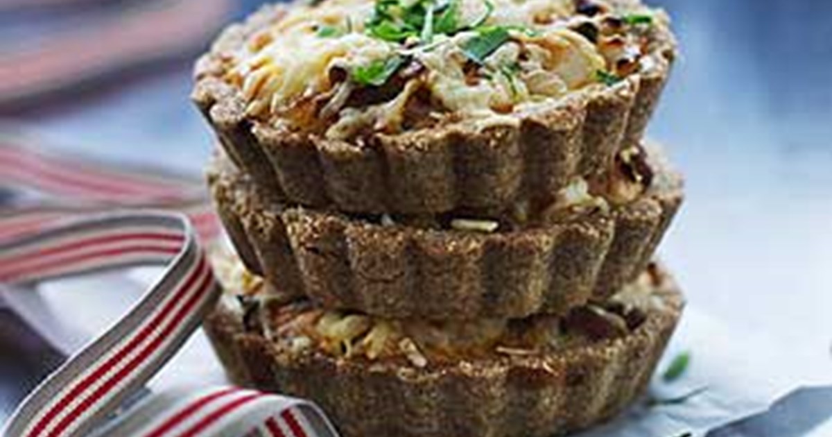 Bag tærterne i ovnen ved 200 grader (almindelig ovnvarme) i 15 minutter. Tag dem ud, og drys osten over, og bag dem yderligere 10 minutter. Køl dem af, inden de tages ud af formene.