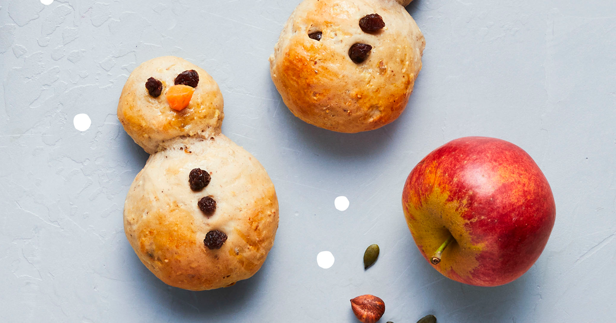 Smelt smørret og hæld det i en skål sammen med mælken. Opløs gæren heri. Tilsæt salt, honning, kanel, æbler, rosiner, nødder og havregryn. Tilsæt melet lidt af gangen og ælt det godt igennem. Lad dejen hæve i en time og form ca. 16 boller. Lad bollerne efterhæve i ½ time og pensl dem med æg og drys med græskarkerner. Bages ved 200 grader i ca. 20 minutter.