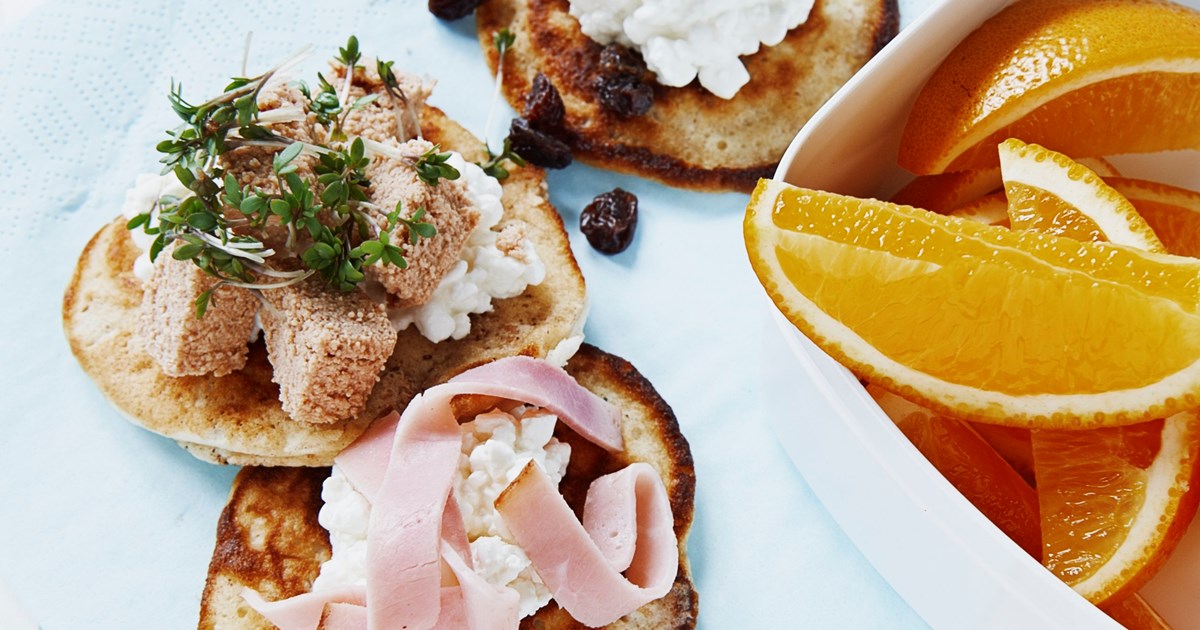 Pak 3 pandekager til hver. Kom hytteosten i 2 bokse med tætsluttende låg. Lav små pakker af rosiner, torskerogn, skinke og karse - så børnene selv kan komme pålægget på pandekagerne. Saml pandekager, hytteost, pålæg og appelsinbåde i plastikposer sammen med en serviet og gaffel til hver.